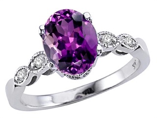 This amazing Tommaso Design(tm) Oval 9x7 Genuine Amethyst and Diamond Ring, available in 14 kt Yellow Gold and 14 kt White Gold. This attractive design is set with 1 stone 1.35 carats prong set medium to dark violet Oval Amethyst, 4 stones 0.04 carats bezel set Round Brilliant Diamond K color I3 clarity. This design measures 7.00 mm wide. Amethyst is February Birthstone: From the Greek 'amethystos' meaning 'sober'. A symbol of trust, Amethyst is thought to protect against seduction and provide peace. Diamond is April Birthstone: From the Greek 'adamas' meaning 'invincible'. A symbol of enduring love, it is believed to bring the wearer luck and success. Made in USA Designer: Tommaso design Studio - This classic design, is made by the renowned Tommaso Design Studio. Tommaso creations are copyrighted, so please be aware of cheap imitations selling online. Only original Tommaso designs are made using the highest quality materials and craftsmanship, backed by an exclusive Lifetime Warranty. Warranty: - This item is covered by Finejewelers exclusive Silver Shield Lifetime Warranty. This exclusive lifetime coverage is offered ONLY by Finejewelers so please shop with confidence, our quality is guaranteed for life!. Metal Available: 14 kt Yellow Gold, 14 kt White Gold.