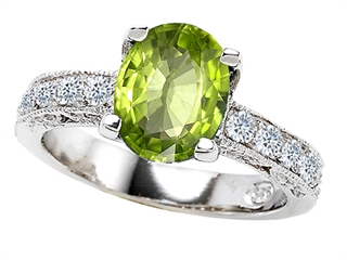 This dazzling Original Star K(tm) 925 Genuine Oval Peridot Ring, crafted in .925 Sterling Silver. This attractive design is set with 1 stone 2.00 carats prong set green-yellow Oval Peridot clean clarity, 14 stones 0.25 carats prong set colorless Oval Cubic Zirconia. This product measures 9.00 mm wide. Peridot is August Birthstone: From the Greek 'Peridona' for 'giving plenty'. A symbol of the sun, Peridot is thought to bring good luck, peace, protection and success. Designer: Star K - This beautiful design, is part of the exclusive Star K. jewelry collection. Star K. designs are copyrighted, so please be aware of cheap imitations selling online. Only original Star K. creations are made using the highest quality materials and craftsmanship, backed by an exclusive Lifetime Warranty. Warranty: - This item is covered by Finejewelers exclusive Silver Shield Lifetime Warranty. This exclusive lifetime coverage is offered ONLY by Finejewelers so please shop with confidence, our quality is guaranteed for life!