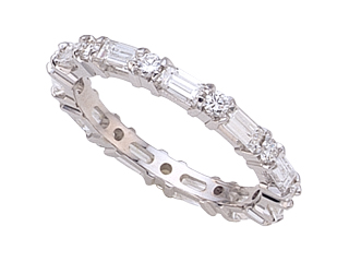This attractive Karina B(tm) Baguette Diamonds Eternity Band, available in a range of metals including 18 kt Yellow Gold, 18 kt White Gold and Platinum 950. This attractive design is set with 11 stones 1.30 carats common prong set Baguette Diamond G color VS1 - VS2 clarity, 11 stones 0.35 carats common prong set Round Brilliant Diamond G color VS2 clarity Diamond is April Birthstone: From the Greek 'adamas' meaning 'invincible'. A symbol of enduring love, it is believed to bring the wearer luck and success. Made in USA Designer: Karina B - Classic style, elegant design and perfect craftsmanship. This is the inspiration behind Karina B. Each design we create is produced with the latest technological advancements in computers and machinery. Every piece of jewelry manufactured is done from scratch according to the exact specifications of the design and stone sizes. Each precious stone is set with the guidance of a master stone setter, using the equipment that was not available in the past, to precise measurements of a hundredth of a millimeter. Combining our manufacturing techniques with high quality diamonds and precious stones along with Platinum or 18 KT gold gives you, the educated consumer, an exceptional masterpiece. If you are lucky enough to own a piece by Karina B., wear it with the confidence and pride of knowing that there is nothing made better. Warranty: - This item is covered by Finejewelers exclusive Silver Shield Lifetime Warranty. This exclusive lifetime coverage is offered ONLY by Finejewelers so please shop with confidence, our quality is guaranteed for life!. Metal Available: 18 kt Yellow Gold, 18 kt White Gold, Platinum 950.
