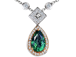 This impressing Original Star K(tm) Two Tone Simulated Pear Shaped Emerald Necklace, crafted in 925 Sterling Silver. This beautiful design is mounted with 1 stone prong set green Pear Shape Simulated emerald clean clarity, 38 stones colorless Round Cubic Zirconia, 1 stone colorless Cubic Zirconia. This style measures 0.50 Inches wide, 1.25 Inches long. Emerald is May Birthstone: From the French 'esmeralde' meaning 'green gem'. A symbol of immortality, it is said to improve memory, wisdom and intuition. Free 18 inches chain included Designer: Star K - This beautiful design, is part of the exclusive Star K. jewelry collection. Star K. designs are copyrighted, so please be aware of cheap imitations selling online. Only original Star K. creations are made using the highest quality materials and craftsmanship, backed by an exclusive Lifetime Warranty. Warranty: - This item is covered by Finejewelers exclusive Silver Shield Lifetime Warranty. This exclusive lifetime coverage is offered ONLY by Finejewelers so please shop with confidence, our quality is guaranteed for life!