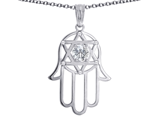 The beautiful Tommaso Design(tm) Large 1.5 inch Hamsa Hand Jewish Star of David Kabbalah Protection Pendant with 6 Genuine Diamonds, crafted in 14 kt White Gold. This beautiful design is mounted with 1 stone 1.00 carats prong set colorless Round White Topaz clean clarity, 6 stones 0.03 carats prong set Round Brilliant Diamond K color I3 clarity. This style measures 22.00 mm wide, 40.00 mm long. Diamond is April Birthstone: From the Greek 'adamas' meaning 'invincible'. A symbol of enduring love, it is believed to bring the wearer luck and success. Free 18 inches chain included Designer: Tommaso design Studio - This classic design, is made by the renowned Tommaso Design Studio. Tommaso creations are copyrighted, so please be aware of cheap imitations selling online. Only original Tommaso designs are made using the highest quality materials and craftsmanship, backed by an exclusive Lifetime Warranty. Warranty: - This item is covered by Finejewelers exclusive Silver Shield Lifetime Warranty. This exclusive lifetime coverage is offered ONLY by Finejewelers so please shop with confidence, our quality is guaranteed for life!