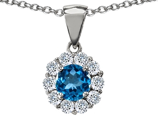 The attractive Original Star K(tm) Genuine Round Blue Topaz Pendant, crafted in .925 Sterling Silver. This beautiful design is mounted with 1 stone 1.00 carats prong set medium to light blue Round Blue Topaz clean clarity, 10 stones 0.70 carats prong set colorless Round Cubic Zirconia. This product measures 10.00 mm wide, 18.00 mm long. Blue Topaz is December Birthstone: From the Greek 'topazos' meaning 'to seek'. Topaz is said to enhance spiritual potential, intelligence, creativity and wealth. Free 18 inches chain included Designer: Star K - This beautiful design, is part of the exclusive Star K. jewelry collection. Star K. designs are copyrighted, so please be aware of cheap imitations selling online. Only original Star K. creations are made using the highest quality materials and craftsmanship, backed by an exclusive Lifetime Warranty. Warranty: - This item is covered by Finejewelers exclusive Silver Shield Lifetime Warranty. This exclusive lifetime coverage is offered ONLY by Finejewelers so please shop with confidence, our quality is guaranteed for life!