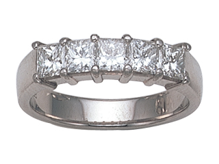 The dazzling Karina B(tm) Princess Diamonds Band, available in a range of metals including 18 kt Yellow Gold, 18 kt White Gold and Platinum 950. This beautiful design is set with 5 stones 1.25 carats common prong set Princess Diamond G color VS1 - VS2 clarity. This style measures 5.00 mm wide. Diamond is April Birthstone: From the Greek 'adamas' meaning 'invincible'. A symbol of enduring love, it is believed to bring the wearer luck and success. Made in USA Designer: Karina B - Classic style, elegant design and perfect craftsmanship. This is the inspiration behind Karina B. Each design we create is produced with the latest technological advancements in computers and machinery. Every piece of jewelry manufactured is done from scratch according to the exact specifications of the design and stone sizes. Each precious stone is set with the guidance of a master stone setter, using the equipment that was not available in the past, to precise measurements of a hundredth of a millimeter. Combining our manufacturing techniques with high quality diamonds and precious stones along with Platinum or 18 KT gold gives you, the educated consumer, an exceptional masterpiece. If you are lucky enough to own a piece by Karina B., wear it with the confidence and pride of knowing that there is nothing made better. Warranty: - This item is covered by Finejewelers exclusive Silver Shield Lifetime Warranty. This exclusive lifetime coverage is offered ONLY by Finejewelers so please shop with confidence, our quality is guaranteed for life!. Metal Available: 18 kt Yellow Gold, 18 kt White Gold, Platinum 950.