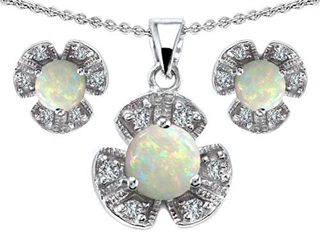 This dazzling Original Star K(tm) Created Opal Flower Pendant Box Set With Matching Earrings, crafted in 925 Sterling Silver. This beautiful design is mounted with 3 stones prong set white iridescent Round Created Opal, 18 stones prong set colorless Round Cubic Zirconia. This style measures 11.50 mm wide, 18.00 mm long. Opal is October Birthstone: From the Greek 'opallios', meaning 'colour change'. A symbol of hope and faithfulness, it inspires true love and brings confidence. Free 18 inches chain included Designer: Star K - This beautiful design, is part of the exclusive Star K. jewelry collection. Star K. designs are copyrighted, so please be aware of cheap imitations selling online. Only original Star K. creations are made using the highest quality materials and craftsmanship, backed by an exclusive Lifetime Warranty. Warranty: - This item is covered by Finejewelers exclusive Silver Shield Lifetime Warranty. This exclusive lifetime coverage is offered ONLY by Finejewelers so please shop with confidence, our quality is guaranteed for life!