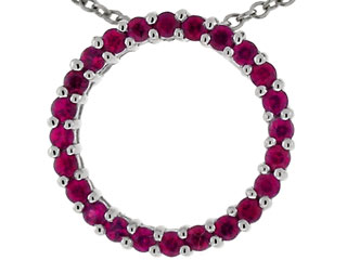 This dazzling Tommaso Design(tm) 19mm. Circle Of Love Pendant made with Genuine Quality Ruby, crafted in 14 kt White Gold. This amazing design is mounted with 24 stones prong set medium to dark red Round Ruby eye clean to slightly included clarity. This design measures 19.00 mm wide, 19.00 mm long. Ruby is July Birthstone: From the Latin 'ruber' meaning 'red'. King of gems and a symbol of royalty, it is said to inspire love, passion, confidence and leadership. Free 18 inches chain included Designer: Tommaso design Studio - This classic design, is made by the renowned Tommaso Design Studio. Tommaso creations are copyrighted, so please be aware of cheap imitations selling online. Only original Tommaso designs are made using the highest quality materials and craftsmanship, backed by an exclusive Lifetime Warranty. Warranty: - This item is covered by Finejewelers exclusive Silver Shield Lifetime Warranty. This exclusive lifetime coverage is offered ONLY by Finejewelers so please shop with confidence, our quality is guaranteed for life!