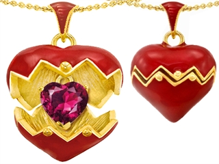 Wear it Close or Open to Reveal the Surprise Birth Stone Inside. 925 Sterling Silver Puffed Heart Pendant with Red Enamel and Heart Shape Gemstone Surprise Inside crafted in 14k Yellow Gold Plated Silver Dimensions: Width: 15.00 mm Length: 30.00 mm1 Stone 1.00 Carats 7 mm Heart Shaped Gemstone Clarity: Clean Free 18 inches chain included .