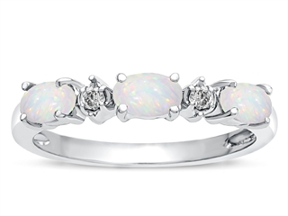 This impressive Tommaso Design(tm) Genuine Opal and Diamond 3 Stone Band, available in 14 kt Yellow Gold and 14 kt White Gold. This amazing design is mounted with 3 stones 0.30 carats prong set white iridescent Oval Opal, 2 stones 0.04 carats prong set Round Brilliant Diamond K color I3 clarity. This design measures 17.00 mm wide. Opal is October Birthstone: From the Greek 'opallios', meaning 'colour change'. A symbol of hope and faithfulness, it inspires true love and brings confidence. Diamond is April Birthstone: From the Greek 'adamas' meaning 'invincible'. A symbol of enduring love, it is believed to bring the wearer luck and success. Made in USA Designer: Tommaso design Studio - This classic design, is made by the renowned Tommaso Design Studio. Tommaso creations are copyrighted, so please be aware of cheap imitations selling online. Only original Tommaso designs are made using the highest quality materials and craftsmanship, backed by an exclusive Lifetime Warranty. Warranty: - This item is covered by Finejewelers exclusive Silver Shield Lifetime Warranty. This exclusive lifetime coverage is offered ONLY by Finejewelers so please shop with confidence, our quality is guaranteed for life!. Metal Available: 14 kt Yellow Gold, 14 kt White Gold.