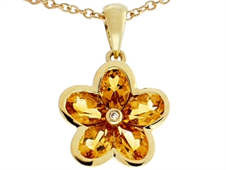 The stunning Tommaso Design(tm) .85 inch long Flower Pendant made with one Diamond and Genuine Pear Shape Citrine., available in 14 kt Yellow Gold and 14 kt White Gold. This attractive design is set with 5 stones 1.80 carats channel set medium to dark yellow-orange Pear Shape Citrine eye clean clarity, 1 stone 0.01 carats burnish Round Brilliant Diamond K color I3 clarity. This product measures 14.50 mm wide, 22.00 mm long. Citrine is November Birthstone: From the French 'citron' for 'lemon'. A symbol of success, is said to protect against sudden death and increase success and prosperity. Diamond is April Birthstone: From the Greek 'adamas' meaning 'invincible'. A symbol of enduring love, it is believed to bring the wearer luck and success. Free 18 inches chain included Designer: Tommaso design Studio - This classic design, is made by the renowned Tommaso Design Studio. Tommaso creations are copyrighted, so please be aware of cheap imitations selling online. Only original Tommaso designs are made using the highest quality materials and craftsmanship, backed by an exclusive Lifetime Warranty. Warranty: - This item is covered by Finejewelers exclusive Silver Shield Lifetime Warranty. This exclusive lifetime coverage is offered ONLY by Finejewelers so please shop with confidence, our quality is guaranteed for life!. Metal Available: 14 kt Yellow Gold, 14 kt White Gold.