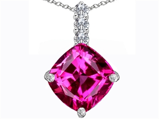 This attractive Original Star K(tm) Large 12mm Cushion Cut Created Pink Sapphire Pendant, crafted in 925 Sterling Silver. This amazing design is mounted with 1 stone prong set pink Cushion Cut Created Pink Sapphire, 3 stones prong set colorless Round Cubic Zirconia. This product measures 15.00 mm wide, 24.00 mm long. Sapphire is September Birthstone: From the Latin 'sapphirus' meaning 'blue'. A symbol for truth and sincerity, it inspires spiritual enlightenment, health and inner peace. Free 18 inches Sterling Silver Chain included Designer: Star K - This beautiful design, is part of the exclusive Star K. jewelry collection. Star K. designs are copyrighted, so please be aware of cheap imitations selling online. Only original Star K. creations are made using the highest quality materials and craftsmanship, backed by an exclusive Lifetime Warranty. Warranty: - This item is covered by Finejewelers exclusive Silver Shield Lifetime Warranty. This exclusive lifetime coverage is offered ONLY by Finejewelers so please shop with confidence, our quality is guaranteed for life!