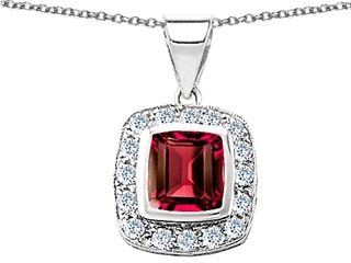 The beautiful Original Star K(tm) Square Cushion Cut Created Ruby Pendant, crafted in 925 Sterling Silver. This amazing design is mounted with 1 stone prong set red Cushion Cut Created Ruby, 16 stones prong set colorless Round Cubic Zirconia. This product measures 15.00 mm wide, 20.00 mm long. Ruby is July Birthstone: From the Latin 'ruber' meaning 'red'. King of gems and a symbol of royalty, it is said to inspire love, passion, confidence and leadership. Free 18 inches chain included Designer: Star K - This beautiful design, is part of the exclusive Star K. jewelry collection. Star K. designs are copyrighted, so please be aware of cheap imitations selling online. Only original Star K. creations are made using the highest quality materials and craftsmanship, backed by an exclusive Lifetime Warranty. Warranty: - This item is covered by Finejewelers exclusive Silver Shield Lifetime Warranty. This exclusive lifetime coverage is offered ONLY by Finejewelers so please shop with confidence, our quality is guaranteed for life!