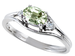 This beautiful Tommaso Design(tm) Genuine Green Amethyst and Diamond Ring, crafted in 10 kt White Gold. This amazing design is mounted with 1 stone 0.35 carats prong set light green Oval Green Amethyst, 2 stones 0.04 carats prong set Round Brilliant Diamond K color I3 clarity. This style measures 8.00 mm wide, 4.00 mm long. Amethyst is February Birthstone: From the Greek 'amethystos' meaning 'sober'. A symbol of trust, Amethyst is thought to protect against seduction and provide peace. Diamond is April Birthstone: From the Greek 'adamas' meaning 'invincible'. A symbol of enduring love, it is believed to bring the wearer luck and success. Designer: Tommaso design Studio - This classic design, is made by the renowned Tommaso Design Studio. Tommaso creations are copyrighted, so please be aware of cheap imitations selling online. Only original Tommaso designs are made using the highest quality materials and craftsmanship, backed by an exclusive Lifetime Warranty. Warranty: - This item is covered by Finejewelers exclusive Silver Shield Lifetime Warranty. This exclusive lifetime coverage is offered ONLY by Finejewelers so please shop with confidence, our quality is guaranteed for life!