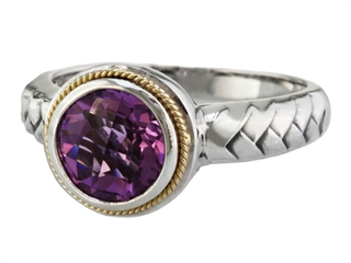 The amazing Balissima By Effy Collection Sterling Silver and 18k Yellow Gold Amethyst Ring, crafted in 925 Silver and 18k Yellow Gold. This amazing design is mounted with 1 stone bezel set violet Round Amethyst eye clean clarity Amethyst is February Birthstone: From the Greek 'amethystos' meaning 'sober'. A symbol of trust, Amethyst is thought to protect against seduction and provide peace. Warranty: - This item is covered by Finejewelers exclusive Silver Shield Lifetime Warranty. This exclusive lifetime coverage is offered ONLY by Finejewelers so please shop with confidence, our quality is guaranteed for life!