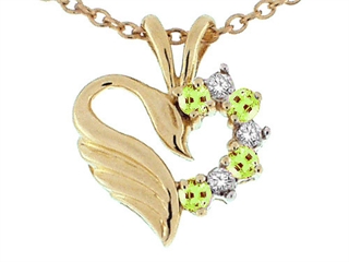 The stunning Tommaso Design(tm) Genuine Heart Shaped Swan Peridot Pendant, available in 14 kt Yellow Gold and 14 kt White Gold. This beautiful design is set with 4 stones 0.18 carats medium to light yellow-green Round Peridot clean clarity, 3 stones 0.04 carats Round Brilliant Diamond K color I3 clarity Peridot is August Birthstone: From the Greek 'Peridona' for 'giving plenty'. A symbol of the sun, Peridot is thought to bring good luck, peace, protection and success. Diamond is April Birthstone: From the Greek 'adamas' meaning 'invincible'. A symbol of enduring love, it is believed to bring the wearer luck and success. Free 18 inches chain included Designer: Tommaso design Studio - This classic design, is made by the renowned Tommaso Design Studio. Tommaso creations are copyrighted, so please be aware of cheap imitations selling online. Only original Tommaso designs are made using the highest quality materials and craftsmanship, backed by an exclusive Lifetime Warranty. Warranty: - This item is covered by Finejewelers exclusive Silver Shield Lifetime Warranty. This exclusive lifetime coverage is offered ONLY by Finejewelers so please shop with confidence, our quality is guaranteed for life!. Metal Available: 14 kt Yellow Gold, 14 kt White Gold.