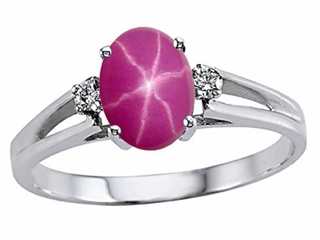 This impressive Tommaso Design(tm) Oval 7x5mm Created Star Ruby and Genuine Diamonds Ring, available in 14 kt White Gold and 14 kt Yellow Gold. This amazing design is set with 1 stone prong set medium red Oval Created Star Ruby, 2 stones prong set Round Brilliant Diamond K color I3 clarity. This product measures 9.00 mm wide. Ruby is July Birthstone: From the Latin 'ruber' meaning 'red'. King of gems and a symbol of royalty, it is said to inspire love, passion, confidence and leadership. Diamond is April Birthstone: From the Greek 'adamas' meaning 'invincible'. A symbol of enduring love, it is believed to bring the wearer luck and success. Made in USA Designer: Tommaso design Studio - This classic design, is made by the renowned Tommaso Design Studio. Tommaso creations are copyrighted, so please be aware of cheap imitations selling online. Only original Tommaso designs are made using the highest quality materials and craftsmanship, backed by an exclusive Lifetime Warranty. Warranty: - This item is covered by Finejewelers exclusive Silver Shield Lifetime Warranty. This exclusive lifetime coverage is offered ONLY by Finejewelers so please shop with confidence, our quality is guaranteed for life!. Metal Available: 14 kt White Gold, 14 kt Yellow Gold.