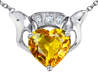 The dazzling Celtic Love by Kelly 8mm Heart Claddagh Pendant With Genuine Citrine, crafted in 925 Sterling Silver. This beautiful design is set with 1 stone prong set medium to light yellow-orange Heart Shape Citrine, 3 stones prong set colorless Round Cubic Zirconia. This style measures 16.50 mm wide, 13.50 mm long. Citrine is November Birthstone: From the French 'citron' for 'lemon'. A symbol of success, is said to protect against sudden death and increase success and prosperity. Free 18 inches chain included Warranty: - This item is covered by Finejewelers exclusive Silver Shield Lifetime Warranty. This exclusive lifetime coverage is offered ONLY by Finejewelers so please shop with confidence, our quality is guaranteed for life!