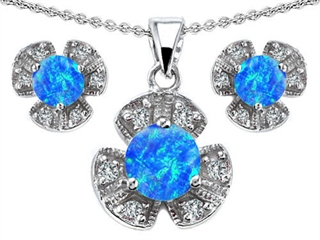 The stunning Original Star K(tm) Created Blue Opal Flower Pendant Box Set With Matching Earrings, crafted in 925 Sterling Silver. This beautiful design is set with 3 stones prong set blue green iridescent Round Created Blue Opal, 18 stones prong set colorless Round Cubic Zirconia. This product measures 11.50 mm wide, 18.00 mm long. Free 18 inches chain included Designer: Star K - This beautiful design, is part of the exclusive Star K. jewelry collection. Star K. designs are copyrighted, so please be aware of cheap imitations selling online. Only original Star K. creations are made using the highest quality materials and craftsmanship, backed by an exclusive Lifetime Warranty. Warranty: - This item is covered by Finejewelers exclusive Silver Shield Lifetime Warranty. This exclusive lifetime coverage is offered ONLY by Finejewelers so please shop with confidence, our quality is guaranteed for life!
