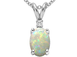 This beautiful Tommaso Design(tm) Oval Genuine Opal and Diamond Pendant, available in 14 kt White Gold and 14 kt Yellow Gold. This attractive design is mounted with 1 stone 0.60 carats prong set white iridescent Oval Opal eye clean clarity, 1 stone 0.02 carats prong set Round Diamond K color I3 clarity. This product measures 6.00 mm wide, 16.00 mm long. Opal is October Birthstone: From the Greek 'opallios', meaning 'colour change'. A symbol of hope and faithfulness, it inspires true love and brings confidence. Diamond is April Birthstone: From the Greek 'adamas' meaning 'invincible'. A symbol of enduring love, it is believed to bring the wearer luck and success. Free 18 inches chain included Designer: Tommaso design Studio - This classic design, is made by the renowned Tommaso Design Studio. Tommaso creations are copyrighted, so please be aware of cheap imitations selling online. Only original Tommaso designs are made using the highest quality materials and craftsmanship, backed by an exclusive Lifetime Warranty. Warranty: - This item is covered by Finejewelers exclusive Silver Shield Lifetime Warranty. This exclusive lifetime coverage is offered ONLY by Finejewelers so please shop with confidence, our quality is guaranteed for life!. Metal Available: 14 kt White Gold, 14 kt Yellow Gold.