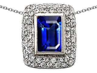 This dazzling Original Star K(tm) Emerald Cut Created Sapphire Pendant, crafted in 925 Sterling Silver. This amazing design is mounted with 1 stone prong set blue Emerald Cut Created Sapphire, 48 stones prong set colorless Round Cubic Zirconia. This product measures 13.00 mm wide, 16.00 mm long. Sapphire is September Birthstone: From the Latin 'sapphirus' meaning 'blue'. A symbol for truth and sincerity, it inspires spiritual enlightenment, health and inner peace. Free 18 inches chain included Designer: Star K - This beautiful design, is part of the exclusive Star K. jewelry collection. Star K. designs are copyrighted, so please be aware of cheap imitations selling online. Only original Star K. creations are made using the highest quality materials and craftsmanship, backed by an exclusive Lifetime Warranty. Warranty: - This item is covered by Finejewelers exclusive Silver Shield Lifetime Warranty. This exclusive lifetime coverage is offered ONLY by Finejewelers so please shop with confidence, our quality is guaranteed for life!