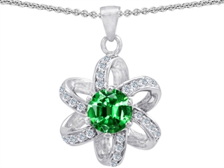 The alluring Original Star K(tm) Round 7mm Simulated Emerald Flower Pendant, crafted in 925 Sterling Silver. This beautiful design is mounted with 1 stone prong set green Round Simulated Emerald, 24 stones prong set colorless Round Brilliant Cubic Zirconia. This product measures 18.00 mm wide, 22.00 mm long. Emerald is May Birthstone: From the French 'esmeralde' meaning 'green gem'. A symbol of immortality, it is said to improve memory, wisdom and intuition. Free 18 inches chain included Designer: Star K - This beautiful design, is part of the exclusive Star K. jewelry collection. Star K. designs are copyrighted, so please be aware of cheap imitations selling online. Only original Star K. creations are made using the highest quality materials and craftsmanship, backed by an exclusive Lifetime Warranty. Warranty: - This item is covered by Finejewelers exclusive Silver Shield Lifetime Warranty. This exclusive lifetime coverage is offered ONLY by Finejewelers so please shop with confidence, our quality is guaranteed for life!