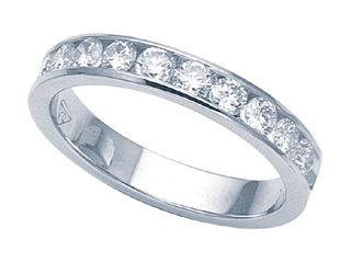 This dazzling Karina B(tm) Round Diamonds Band, available in a range of metals including 18 kt Yellow Gold, 18 kt White Gold and Platinum 950. This attractive design is set with 10 stones 0.75 carats channel set Round Brilliant Diamond G color VS1 - VS2 clarity. This style measures 3.40 mm wide. Diamond is April Birthstone: From the Greek 'adamas' meaning 'invincible'. A symbol of enduring love, it is believed to bring the wearer luck and success. Made in USA Designer: Karina B - Classic style, elegant design and perfect craftsmanship. This is the inspiration behind Karina B. Each design we create is produced with the latest technological advancements in computers and machinery. Every piece of jewelry manufactured is done from scratch according to the exact specifications of the design and stone sizes. Each precious stone is set with the guidance of a master stone setter, using the equipment that was not available in the past, to precise measurements of a hundredth of a millimeter. Combining our manufacturing techniques with high quality diamonds and precious stones along with Platinum or 18 KT gold gives you, the educated consumer, an exceptional masterpiece. If you are lucky enough to own a piece by Karina B., wear it with the confidence and pride of knowing that there is nothing made better. Warranty: - This item is covered by Finejewelers exclusive Silver Shield Lifetime Warranty. This exclusive lifetime coverage is offered ONLY by Finejewelers so please shop with confidence, our quality is guaranteed for life!. Metal Available: 18 kt Yellow Gold, 18 kt White Gold, Platinum 950.