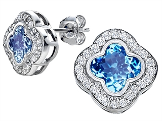This impressive Original Star K(tm) Clover Earring Studs with 8mm Clover Cut Simulated Blue Topaz, crafted in 925 Sterling Silver. This attractive design is mounted with 2 stones bezel set medium to light blue Clover Simulated Blue Topaz, 48 stones channel set colorless Round Brilliant Cubic Zirconia. This style measures 11.00 mm wide, 11.00 mm long. Blue Topaz is December Birthstone: From the Greek 'topazos' meaning 'to seek'. Topaz is said to enhance spiritual potential, intelligence, creativity and wealth. Designer: Star K - This beautiful design, is part of the exclusive Star K. jewelry collection. Star K. designs are copyrighted, so please be aware of cheap imitations selling online. Only original Star K. creations are made using the highest quality materials and craftsmanship, backed by an exclusive Lifetime Warranty. Warranty: - This item is covered by Finejewelers exclusive Silver Shield Lifetime Warranty. This exclusive lifetime coverage is offered ONLY by Finejewelers so please shop with confidence, our quality is guaranteed for life!