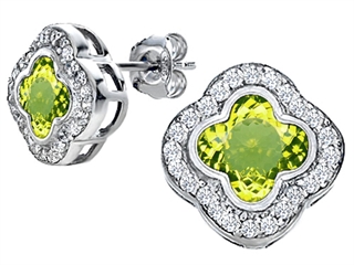 The stunning Original Star K(tm) Clover Earring Studs with 8mm Clover Cut Simulated Peridot, crafted in 925 Sterling Silver. This beautiful design is set with 2 stones bezel set green-yellow Clover Simulated Peridot, 48 stones channel set colorless Round Brilliant Cubic Zirconia. This design measures 11.00 mm wide, 11.00 mm long. Peridot is August Birthstone: From the Greek 'Peridona' for 'giving plenty'. A symbol of the sun, Peridot is thought to bring good luck, peace, protection and success. Designer: Star K - This beautiful design, is part of the exclusive Star K. jewelry collection. Star K. designs are copyrighted, so please be aware of cheap imitations selling online. Only original Star K. creations are made using the highest quality materials and craftsmanship, backed by an exclusive Lifetime Warranty. Warranty: - This item is covered by Finejewelers exclusive Silver Shield Lifetime Warranty. This exclusive lifetime coverage is offered ONLY by Finejewelers so please shop with confidence, our quality is guaranteed for life!