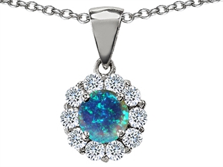 The impressive Original Star K(tm) Round 6mm Created Blue Opal Pendant, crafted in 925 Sterling Silver. This attractive design is mounted with 1 stone prong set blue iridescent Round Created Blue Opal, 10 stones prong set colorless Round Cubic Zirconia. This product measures 10.00 mm wide, 18.00 mm long. Free 18 inches chain included Designer: Star K - This beautiful design, is part of the exclusive Star K. jewelry collection. Star K. designs are copyrighted, so please be aware of cheap imitations selling online. Only original Star K. creations are made using the highest quality materials and craftsmanship, backed by an exclusive Lifetime Warranty. Warranty: - This item is covered by Finejewelers exclusive Silver Shield Lifetime Warranty. This exclusive lifetime coverage is offered ONLY by Finejewelers so please shop with confidence, our quality is guaranteed for life!