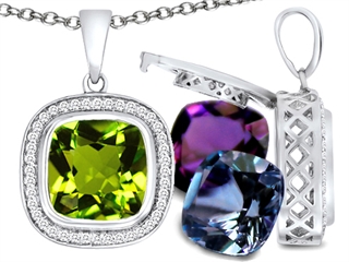 This dazzling Switch-It Gems(tm) Interchangeable Simulated Peridot Pendant Set with 12 Cushion Cut 10mm Birthstones Included, crafted in 925 Sterling Silver. This attractive design is mounted with 32 stones channel set colorless Round Brilliant Cubic Zirconia. This product measures 14.00 mm wide, 22.00 mm long. Peridot is August Birthstone: From the Greek 'Peridona' for 'giving plenty'. A symbol of the sun, Peridot is thought to bring good luck, peace, protection and success. Free 18 inches chain included 12 Cushion Cut 10mm Simulated Birthstone Included Switch-It Gem(tm) Designs are protected by US Copyright and Patent Laws Warranty: - This item is covered by Finejewelers exclusive Silver Shield Lifetime Warranty. This exclusive lifetime coverage is offered ONLY by Finejewelers so please shop with confidence, our quality is guaranteed for life!
