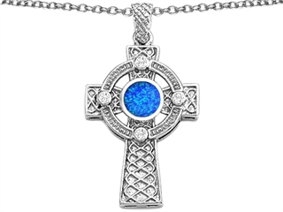 The impressing Celtic Love by Kelly(tm) Celtic Cross pendant with 7mm Round Created Blue Opal, crafted in 925 Sterling Silver. This beautiful design is set with 1 stone prong set blue green iridescent Round Created Blue Opal, 4 stones prong set colorless Round Brilliant Cubic Zirconia. This product measures 19.00 mm wide, 36.00 mm long. Free 18 inches chain included Warranty: - This item is covered by Finejewelers exclusive Silver Shield Lifetime Warranty. This exclusive lifetime coverage is offered ONLY by Finejewelers so please shop with confidence, our quality is guaranteed for life!
