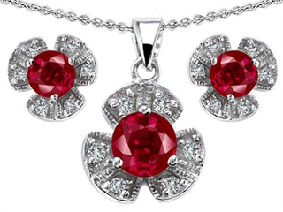 The impressing Original Star K(tm) Created Ruby Flower Pendant Box Set With Matching Earrings, crafted in 925 Sterling Silver. This amazing design is mounted with 3 stones prong set red Round Created Ruby, 18 stones prong set colorless Round Cubic Zirconia. This style measures 11.50 mm wide, 18.00 mm long. Ruby is July Birthstone: From the Latin 'ruber' meaning 'red'. King of gems and a symbol of royalty, it is said to inspire love, passion, confidence and leadership. Free 18 inches chain included Designer: Star K - This beautiful design, is part of the exclusive Star K. jewelry collection. Star K. designs are copyrighted, so please be aware of cheap imitations selling online. Only original Star K. creations are made using the highest quality materials and craftsmanship, backed by an exclusive Lifetime Warranty. Warranty: - This item is covered by Finejewelers exclusive Silver Shield Lifetime Warranty. This exclusive lifetime coverage is offered ONLY by Finejewelers so please shop with confidence, our quality is guaranteed for life!