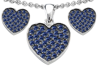 This alluring Original Star K(tm) Created Sapphire Heart Shape Love Pendant Box Set with matching earrings, crafted in 925 Sterling Silver. This amazing design is set with 87 stones prong set blue Round Created Sapphire. This design measures 15.00 mm wide, 21.00 mm long. Sapphire is September Birthstone: From the Latin 'sapphirus' meaning 'blue'. A symbol for truth and sincerity, it inspires spiritual enlightenment, health and inner peace. Free 18 inches chain included Designer: Star K - This beautiful design, is part of the exclusive Star K. jewelry collection. Star K. designs are copyrighted, so please be aware of cheap imitations selling online. Only original Star K. creations are made using the highest quality materials and craftsmanship, backed by an exclusive Lifetime Warranty. Warranty: - This item is covered by Finejewelers exclusive Silver Shield Lifetime Warranty. This exclusive lifetime coverage is offered ONLY by Finejewelers so please shop with confidence, our quality is guaranteed for life!