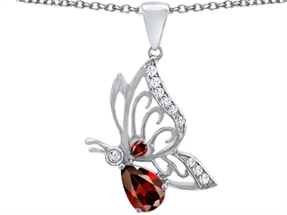 This impressing Original Star K(tm) Butterfly Pendant With 9x6mm Pear Shape Simulated Garnet, crafted in 925 Sterling Silver. This beautiful design is mounted with 1 stone prong set red-brown Pear Shape Simulated Garnet clean clarity, 10 stones prong set colorless Round Brilliant Cubic Zirconia. This design measures 17.00 mm wide, 34.00 mm long. Garnet is January Birthstone: From the Latin word 'granatus', the seeds of a pomegranate fruit. A symbol of fidelity, Garnet's powers include healing, strength, protection. Free 18 inches chain included Designer: Star K - This beautiful design, is part of the exclusive Star K. jewelry collection. Star K. designs are copyrighted, so please be aware of cheap imitations selling online. Only original Star K. creations are made using the highest quality materials and craftsmanship, backed by an exclusive Lifetime Warranty. Warranty: - This item is covered by Finejewelers exclusive Silver Shield Lifetime Warranty. This exclusive lifetime coverage is offered ONLY by Finejewelers so please shop with confidence, our quality is guaranteed for life!