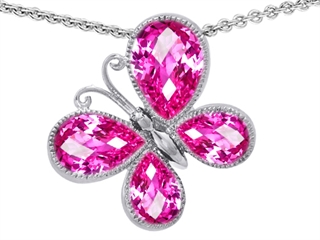 The attractive Original Star K(tm) Butterfly with Pear Shape Created Pink Sapphire Pendant, crafted in 925 Sterling Silver. This attractive design is set with 1 stone prong set pink Pear Shape Created Pink Sapphire, 1 stone prong set pink Pear Shape Created Pink Sapphire, 2 stones prong set pink Pear Shape Created Pink Sapphire. This style measures 25.00 mm wide, 25.00 mm long. Sapphire is September Birthstone: From the Latin 'sapphirus' meaning 'blue'. A symbol for truth and sincerity, it inspires spiritual enlightenment, health and inner peace. Free 18 inches chain included Designer: Star K - This beautiful design, is part of the exclusive Star K. jewelry collection. Star K. designs are copyrighted, so please be aware of cheap imitations selling online. Only original Star K. creations are made using the highest quality materials and craftsmanship, backed by an exclusive Lifetime Warranty. Warranty: - This item is covered by Finejewelers exclusive Silver Shield Lifetime Warranty. This exclusive lifetime coverage is offered ONLY by Finejewelers so please shop with confidence, our quality is guaranteed for life!