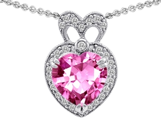 This impressive Original Star K(tm) Heart Shape Created Pink Sapphire And Cubic Zirconia Pendant, crafted in 925 Sterling Silver. This beautiful design is mounted with 1 stone prong set pink Heart Shape Created Pink Sapphire, 27 stones prong set colorless Round Brilliant Cubic Zirconia. This product measures 12.00 mm wide, 19.00 mm long. Sapphire is September Birthstone: From the Latin 'sapphirus' meaning 'blue'. A symbol for truth and sincerity, it inspires spiritual enlightenment, health and inner peace. Free 18 inches chain included Designer: Star K - This beautiful design, is part of the exclusive Star K. jewelry collection. Star K. designs are copyrighted, so please be aware of cheap imitations selling online. Only original Star K. creations are made using the highest quality materials and craftsmanship, backed by an exclusive Lifetime Warranty. Warranty: - This item is covered by Finejewelers exclusive Silver Shield Lifetime Warranty. This exclusive lifetime coverage is offered ONLY by Finejewelers so please shop with confidence, our quality is guaranteed for life!