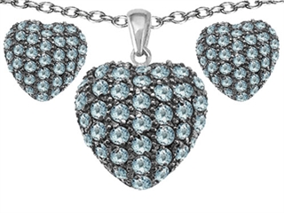 This beautiful Original Star K(tm) Simulated Aquamarine Puffed Heart Love Pendant Box Set with matching earrings, crafted in 925 Sterling Silver. This beautiful design is set with 115 stones prong set faint blue Round Simulated Aquamarine. This style measures 14.00 mm wide, 16.00 mm long. Aquamarine is March Birthstone: From the latin `aqua` and `mare` meaning 'sea water'. Aquamarine is said to provide everlasting youth, courage, and happiness. Free 18 inches chain included Designer: Star K - This beautiful design, is part of the exclusive Star K. jewelry collection. Star K. designs are copyrighted, so please be aware of cheap imitations selling online. Only original Star K. creations are made using the highest quality materials and craftsmanship, backed by an exclusive Lifetime Warranty. Warranty: - This item is covered by Finejewelers exclusive Silver Shield Lifetime Warranty. This exclusive lifetime coverage is offered ONLY by Finejewelers so please shop with confidence, our quality is guaranteed for life!