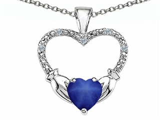 This amazing Celtic Love by Kelly Hands Holding your Heart Created Star Sapphire and Diamond Claddagh Pendant, available in 10 kt White Gold and 10 kt Yellow Gold. This beautiful design is mounted with 1 stone prong set blue Heart Shape Created Star Sapphire, 5 stones prong set Round Brilliant Diamond K color I3 clarity. This design measures 18.50 mm wide, 23.00 mm long. Sapphire is September Birthstone: From the Latin 'sapphirus' meaning 'blue'. A symbol for truth and sincerity, it inspires spiritual enlightenment, health and inner peace. Diamond is April Birthstone: From the Greek 'adamas' meaning 'invincible'. A symbol of enduring love, it is believed to bring the wearer luck and success. Free 18 inches chain included Warranty: - This item is covered by Finejewelers exclusive Silver Shield Lifetime Warranty. This exclusive lifetime coverage is offered ONLY by Finejewelers so please shop with confidence, our quality is guaranteed for life!. Metal Available: 10 kt White Gold, 10 kt Yellow Gold.