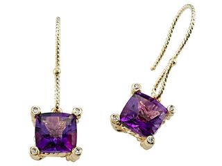 The stunning Genuine Amethyst Earrings by Effy Collection(r), available in 14 kt Yellow Gold and 14 kt White Gold. This attractive design is set with 8 stones 0.03 carats bezel set Round Brilliant Diamond other-color color I2-I3 clarity, 2 stones 2.76 carats prong set medium to dark violet Square Amethyst eye clean clarity Diamond is April Birthstone: From the Greek 'adamas' meaning 'invincible'. A symbol of enduring love, it is believed to bring the wearer luck and success. Amethyst is February Birthstone: From the Greek 'amethystos' meaning 'sober'. A symbol of trust, Amethyst is thought to protect against seduction and provide peace. Warranty: - This item is covered by Finejewelers exclusive Silver Shield Lifetime Warranty. This exclusive lifetime coverage is offered ONLY by Finejewelers so please shop with confidence, our quality is guaranteed for life!. Metal Available: 14 kt Yellow Gold, 14 kt White Gold.