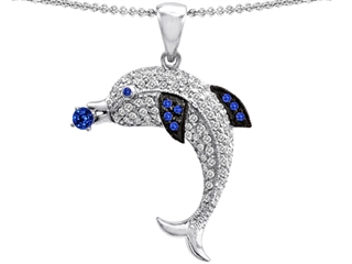 This impressing Original Star K(tm) Dolphin Pendant With Created Sapphire And Cubic Zirconia, crafted in 925 Sterling Silver. This attractive design is mounted with 9 stones prong set blue Round Created Sapphire clean clarity, 70 stones prong set colorless Round Cubic Zirconia. This product measures 24.00 mm wide, 31.00 mm long. Sapphire is September Birthstone: From the Latin 'sapphirus' meaning 'blue'. A symbol for truth and sincerity, it inspires spiritual enlightenment, health and inner peace. Free 18 inches Sterling Silver Chain included Designer: Star K - This beautiful design, is part of the exclusive Star K. jewelry collection. Star K. designs are copyrighted, so please be aware of cheap imitations selling online. Only original Star K. creations are made using the highest quality materials and craftsmanship, backed by an exclusive Lifetime Warranty. Warranty: - This item is covered by Finejewelers exclusive Silver Shield Lifetime Warranty. This exclusive lifetime coverage is offered ONLY by Finejewelers so please shop with confidence, our quality is guaranteed for life!