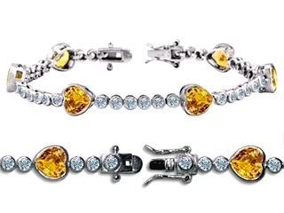 The attractive Original Star K(tm) High End Tennis Bracelet With 6pcs 7mm Heart Genuine Citrine, crafted in 925 Sterling Silver. This amazing design is set with 6 stones bezel set medium to light yellow-orange Heart Shape Citrine, 36 stones prong set colorless Round Cubic Zirconia. This design measures 0.28 Inches wide, 7.50 Inches long. Citrine is November Birthstone: From the French 'citron' for 'lemon'. A symbol of success, is said to protect against sudden death and increase success and prosperity. Designer: Star K - This beautiful design, is part of the exclusive Star K. jewelry collection. Star K. designs are copyrighted, so please be aware of cheap imitations selling online. Only original Star K. creations are made using the highest quality materials and craftsmanship, backed by an exclusive Lifetime Warranty. Warranty: - This item is covered by Finejewelers exclusive Silver Shield Lifetime Warranty. This exclusive lifetime coverage is offered ONLY by Finejewelers so please shop with confidence, our quality is guaranteed for life!