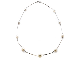Genuine Pearl and Silver Necklace crafted in 925 Sterling Silver 9 Oval Shaped white Pearls 6-7mm in size each.
