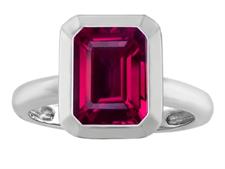 The alluring Original Star K(tm) 9x7mm Emerald Cut Octagon Solitaire Engagement Ring With Created Ruby, crafted in 925 Sterling Silver. This amazing design is mounted with 1 stone bezel set red Emerald Cut Created Ruby. This style measures 10.00 mm wide, 11.00 mm long. Ruby is July Birthstone: From the Latin 'ruber' meaning 'red'. King of gems and a symbol of royalty, it is said to inspire love, passion, confidence and leadership. Designer: Star K - This beautiful design, is part of the exclusive Star K. jewelry collection. Star K. designs are copyrighted, so please be aware of cheap imitations selling online. Only original Star K. creations are made using the highest quality materials and craftsmanship, backed by an exclusive Lifetime Warranty. Warranty: - This item is covered by Finejewelers exclusive Silver Shield Lifetime Warranty. This exclusive lifetime coverage is offered ONLY by Finejewelers so please shop with confidence, our quality is guaranteed for life!