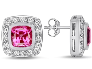 This stunning Original Star K(tm) 7mm Cushion Cut Created Pink Sapphire Earring Studs, crafted in 925 Sterling Silver. This amazing design is mounted with 2 stones prong set pink Cushion Cut Created Pink Sapphire, 32 stones prong set colorless Round Cubic Zirconia. This design measures 14.00 mm wide, 14.00 mm long. Sapphire is September Birthstone: From the Latin 'sapphirus' meaning 'blue'. A symbol for truth and sincerity, it inspires spiritual enlightenment, health and inner peace. Designer: Star K - This beautiful design, is part of the exclusive Star K. jewelry collection. Star K. designs are copyrighted, so please be aware of cheap imitations selling online. Only original Star K. creations are made using the highest quality materials and craftsmanship, backed by an exclusive Lifetime Warranty. Warranty: - This item is covered by Finejewelers exclusive Silver Shield Lifetime Warranty. This exclusive lifetime coverage is offered ONLY by Finejewelers so please shop with confidence, our quality is guaranteed for life!