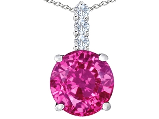 This amazing Original Star K(tm) Large 12mm Round Created Pink Sapphire Pendant, crafted in 925 Sterling Silver. This amazing design is mounted with 1 stone prong set pink Round Created Pink Sapphire, 3 stones prong set colorless Round Cubic Zirconia. This style measures 12.00 mm wide, 21.00 mm long. Sapphire is September Birthstone: From the Latin 'sapphirus' meaning 'blue'. A symbol for truth and sincerity, it inspires spiritual enlightenment, health and inner peace. Free 18 inches Sterling Silver Chain included Designer: Star K - This beautiful design, is part of the exclusive Star K. jewelry collection. Star K. designs are copyrighted, so please be aware of cheap imitations selling online. Only original Star K. creations are made using the highest quality materials and craftsmanship, backed by an exclusive Lifetime Warranty. Warranty: - This item is covered by Finejewelers exclusive Silver Shield Lifetime Warranty. This exclusive lifetime coverage is offered ONLY by Finejewelers so please shop with confidence, our quality is guaranteed for life!