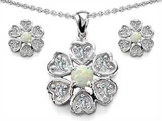 The beautiful Original Star K(tm) Created Opal Flower Pendant Box Set With Matching Earrings, crafted in 925 Sterling Silver. This beautiful design is mounted with 3 stones prong set white iridescent Round Created Opal clean clarity, 18 stones prong set colorless Round Cubic Zirconia. This style measures 13.50 mm wide, 21.00 mm long. Opal is October Birthstone: From the Greek 'opallios', meaning 'colour change'. A symbol of hope and faithfulness, it inspires true love and brings confidence. Free 18 inches chain included Designer: Star K - This beautiful design, is part of the exclusive Star K. jewelry collection. Star K. designs are copyrighted, so please be aware of cheap imitations selling online. Only original Star K. creations are made using the highest quality materials and craftsmanship, backed by an exclusive Lifetime Warranty. Warranty: - This item is covered by Finejewelers exclusive Silver Shield Lifetime Warranty. This exclusive lifetime coverage is offered ONLY by Finejewelers so please shop with confidence, our quality is guaranteed for life!