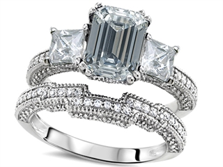 This attractive Original Star K(tm) Emerald Cut 8x6mm Genuine White Topaz Engagement Wedding Set, crafted in 925 Sterling Silver. This attractive design is mounted with 1 stone prong set colorless Emerald Cut White Topaz, 2 stones prong set colorless Square Cubic Zirconia, 58 stones prong set colorless Round Brilliant Cubic Zirconia. This style measures 15.00 mm wide, 8.00 mm long. Designer: Star K - This beautiful design, is part of the exclusive Star K. jewelry collection. Star K. designs are copyrighted, so please be aware of cheap imitations selling online. Only original Star K. creations are made using the highest quality materials and craftsmanship, backed by an exclusive Lifetime Warranty. Warranty: - This item is covered by Finejewelers exclusive Silver Shield Lifetime Warranty. This exclusive lifetime coverage is offered ONLY by Finejewelers so please shop with confidence, our quality is guaranteed for life!