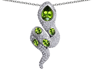 The impressing Original Star K(tm) Good Luck Snake Pendant with Simulated Peridot Stones, crafted in 925 Sterling Silver. This beautiful design is mounted with 1 stone bezel set green-yellow Pear Shape Simulated Peridot clean clarity, 2 stones bezel set green-yellow Oval Simulated Peridot clean clarity, 2 stones bezel set green-yellow Oval Simulated Peridot clean clarity, 150 stones prong set colorless Round Brilliant Cubic Zirconia. This design measures 21.00 mm wide, 45.00 mm long. Peridot is August Birthstone: From the Greek 'Peridona' for 'giving plenty'. A symbol of the sun, Peridot is thought to bring good luck, peace, protection and success. Free 18 inches Sterling Silver Chain included Designer: Star K - This beautiful design, is part of the exclusive Star K. jewelry collection. Star K. designs are copyrighted, so please be aware of cheap imitations selling online. Only original Star K. creations are made using the highest quality materials and craftsmanship, backed by an exclusive Lifetime Warranty. Warranty: - This item is covered by Finejewelers exclusive Silver Shield Lifetime Warranty. This exclusive lifetime coverage is offered ONLY by Finejewelers so please shop with confidence, our quality is guaranteed for life!