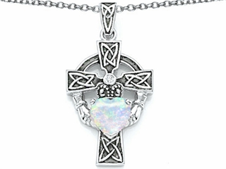 This stunning Celtic Love by Kelly(tm) Claddagh Cross pendant with 7mm Heart Shape Created Opal, crafted in 925 Sterling Silver. This beautiful design is set with 1 stone prong set white iridescent Heart Shape Created Opal clean clarity, 1 stone prong set colorless Round Brilliant Cubic Zirconia. This style measures 16.00 mm wide, 32.00 mm long. Opal is October Birthstone: From the Greek 'opallios', meaning 'colour change'. A symbol of hope and faithfulness, it inspires true love and brings confidence. Free 18 inches chain included Warranty: - This item is covered by Finejewelers exclusive Silver Shield Lifetime Warranty. This exclusive lifetime coverage is offered ONLY by Finejewelers so please shop with confidence, our quality is guaranteed for life!