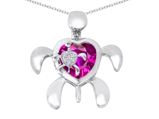 This amazing Original Star K(tm) Good Luck Mother and Child Turtle Pendant with Heart Shape Created Pink Sapphire, crafted in 925 Sterling Silver. This amazing design is mounted with 1 stone bezel set pink Heart Shape Created Pink Sapphire clean clarity, 6 stones prong set colorless Round Brilliant Cubic Zirconia. This style measures 22.00 mm wide, 22.00 mm long. Sapphire is September Birthstone: From the Latin 'sapphirus' meaning 'blue'. A symbol for truth and sincerity, it inspires spiritual enlightenment, health and inner peace. Free 18 inches Sterling Silver Chain included Designer: Star K - This beautiful design, is part of the exclusive Star K. jewelry collection. Star K. designs are copyrighted, so please be aware of cheap imitations selling online. Only original Star K. creations are made using the highest quality materials and craftsmanship, backed by an exclusive Lifetime Warranty. Warranty: - This item is covered by Finejewelers exclusive Silver Shield Lifetime Warranty. This exclusive lifetime coverage is offered ONLY by Finejewelers so please shop with confidence, our quality is guaranteed for life!