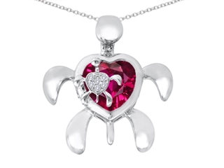 The alluring Original Star K(tm) Good Luck Mother and Child Turtle Pendant with Heart Shape Created Ruby, crafted in 925 Sterling Silver. This beautiful design is mounted with 1 stone bezel set red Heart Shape Created Ruby clean clarity, 6 stones prong set colorless Round Brilliant Cubic Zirconia. This style measures 22.00 mm wide, 22.00 mm long. Ruby is July Birthstone: From the Latin 'ruber' meaning 'red'. King of gems and a symbol of royalty, it is said to inspire love, passion, confidence and leadership. Free 18 inches Sterling Silver Chain included Designer: Star K - This beautiful design, is part of the exclusive Star K. jewelry collection. Star K. designs are copyrighted, so please be aware of cheap imitations selling online. Only original Star K. creations are made using the highest quality materials and craftsmanship, backed by an exclusive Lifetime Warranty. Warranty: - This item is covered by Finejewelers exclusive Silver Shield Lifetime Warranty. This exclusive lifetime coverage is offered ONLY by Finejewelers so please shop with confidence, our quality is guaranteed for life!
