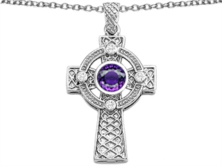 The amazing Celtic Love by Kelly(tm) Celtic Cross pendant with 7mm Round Simulated Amethyst, crafted in 925 Sterling Silver. This amazing design is mounted with 1 stone prong set violet Round Simulated Amethyst clean clarity, 4 stones prong set colorless Round Brilliant Cubic Zirconia. This design measures 19.00 mm wide, 36.00 mm long. Amethyst is February Birthstone: From the Greek 'amethystos' meaning 'sober'. A symbol of trust, Amethyst is thought to protect against seduction and provide peace. Free 18 inches chain included Warranty: - This item is covered by Finejewelers exclusive Silver Shield Lifetime Warranty. This exclusive lifetime coverage is offered ONLY by Finejewelers so please shop with confidence, our quality is guaranteed for life!